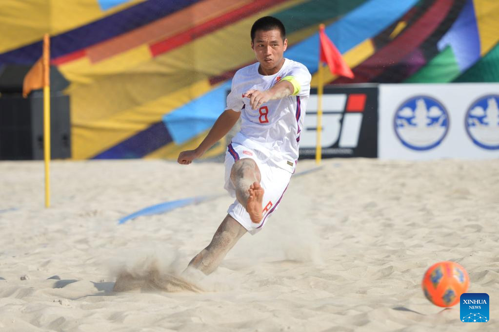 Cai Weiming of China shoots during the Group C match between China and Lebanon at Beach Soccer Asian Cup 2023 in Pattaya, Thailand, March 17, 2023. (Xinhua/Rachen Sageamsak)