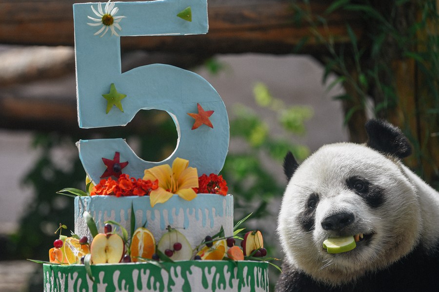 Giant panda Ru Yi takes a bite of its birthday cake at the Moscow Zoo in Moscow, capital of Russia, July 31, 2021. (Xinhua/Evgeny Sinitsyn)