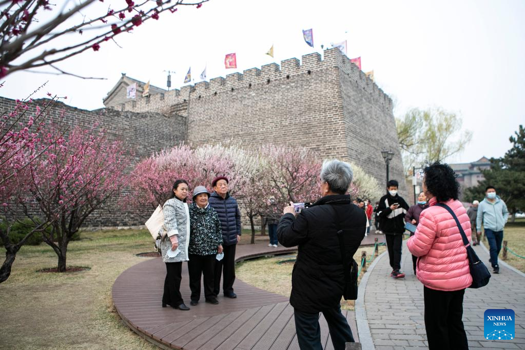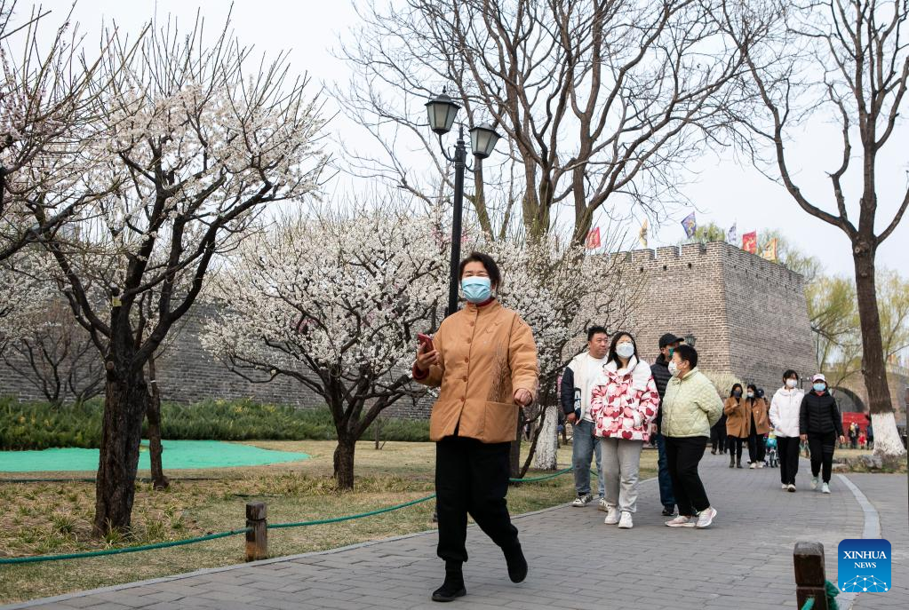 People view blooming flowers at the Ming City Wall Site Park in Beijing, capital of China, March 19, 2023. Blooming flowers have attracted many tourists to the park recently. (Xinhua/Zhang Fan)