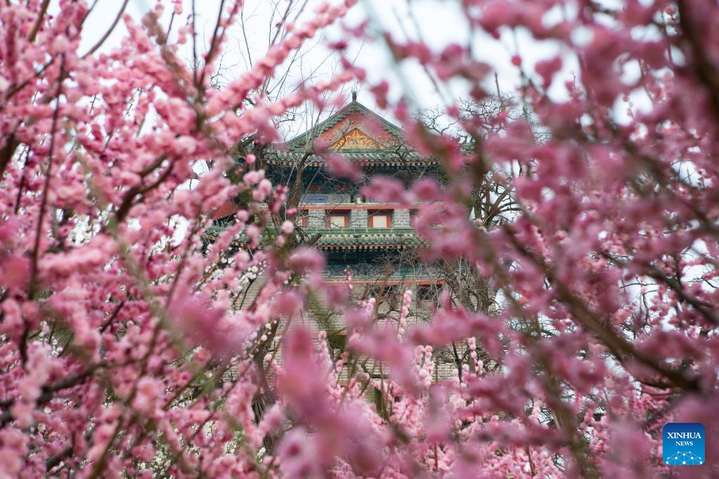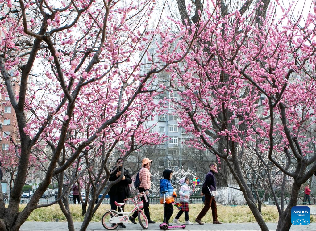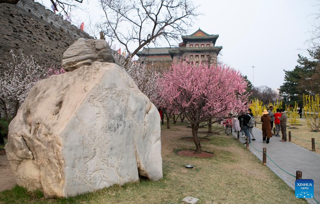 This photo taken on March 19, 2023 shows blooming flowers at the Ming City Wall Site Park in Beijing, capital of China. Blooming flowers have attracted many tourists to the park recently. (Xinhua/Zhang Fan)