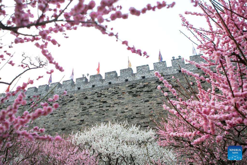 This photo taken on March 19, 2023 shows an ancient city wall at the Ming City Wall Site Park in Beijing, capital of China. Blooming flowers have attracted many tourists to the park recently. (Xinhua/Zhang Fan)