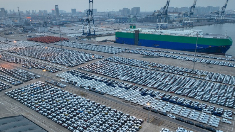 This aerial photo taken on Jan. 18, 2023 shows vehicles waiting for shipment at Yantai Port in Yantai, east China's Shandong Province. (Xinhua/Zhu Zheng)