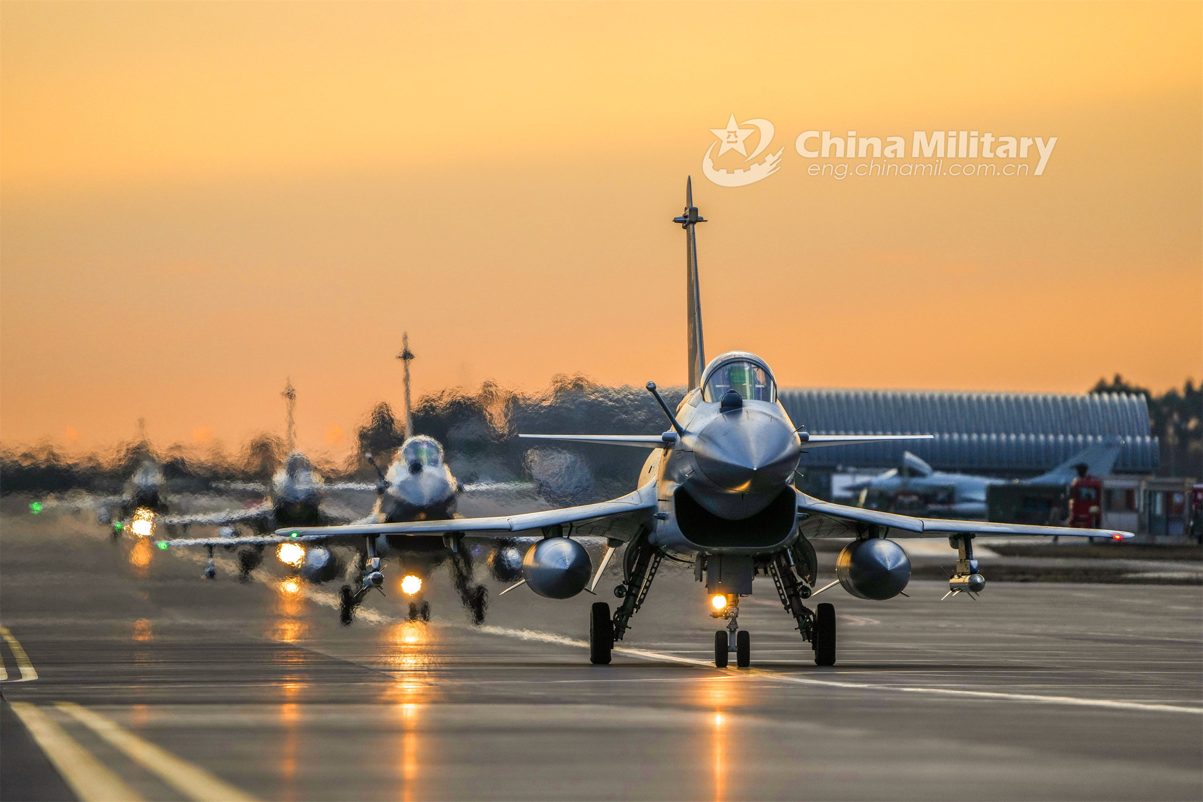 J-10 fighter jets attached to an aviation brigade of the air force under the PLA Southern Theater Command taxi down the flightline in formation before takeoff for a 24-hour flight training exercise recently. (eng.chinamil.com.cn/Photo by Wang Guoyun)