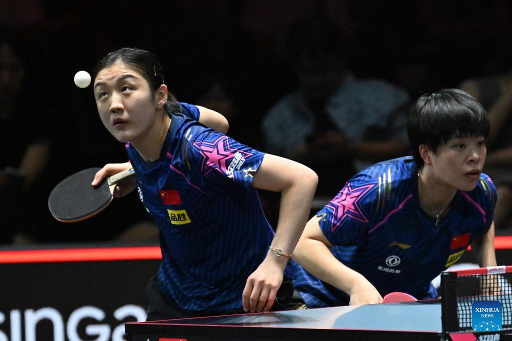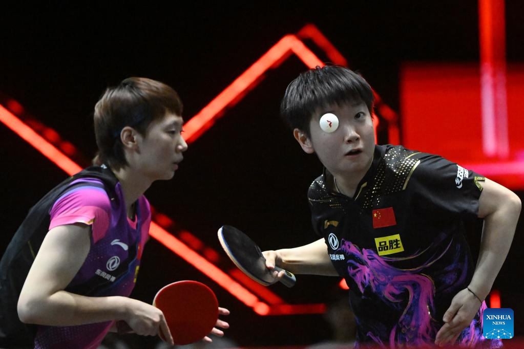 Wang Manyu/Sun Yingsha (R) of China compete during the women's doubles final against their compatriots Chen Meng/Wang Yidi at the World Table Tennis (WTT) Singapore Smash in Singapore, March 18, 2023. (Photo by Then Chih Wey/Xinhua)