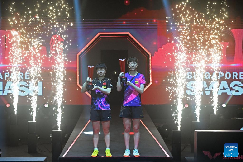 Winners Wang Manyu (R)/Sun Yingsha of China pose with the trophies during the awarding ceremony after the women's doubles final against their compatriots Chen Meng/Wang Yidi at the World Table Tennis (WTT) Singapore Smash in Singapore, March 18, 2023. (Photo by Then Chih Wey/Xinhua)