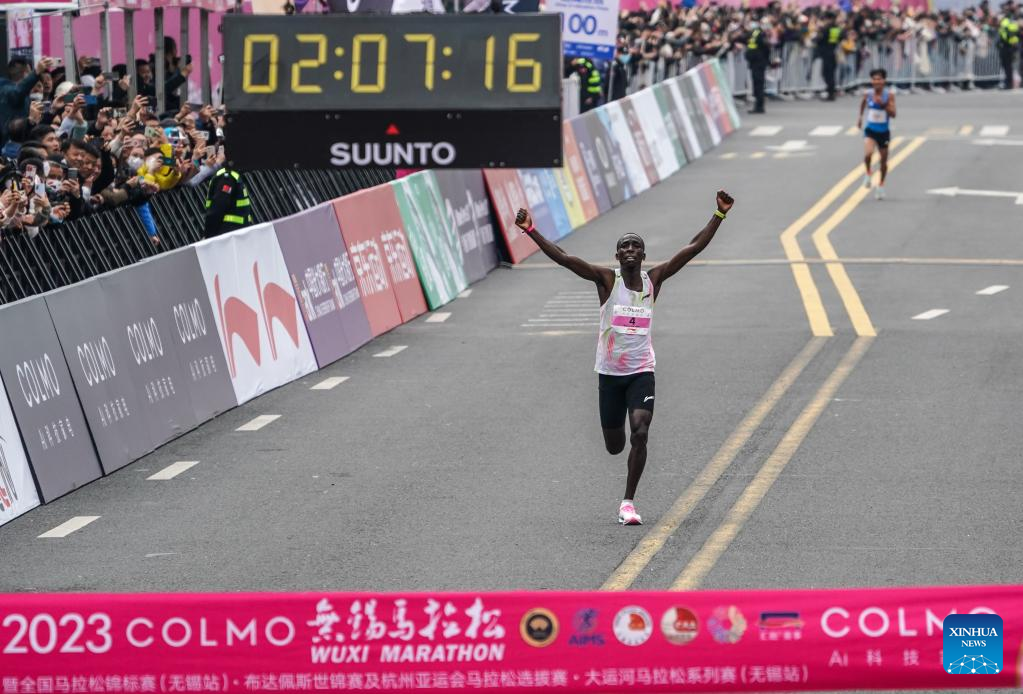 Enock Onchari of Kenya celebrates during the men's competition at the 2023 Wuxi Marathon in Wuxi, east China's Jiangsu Province, March 19, 2023. (Xinhua/Yang Lei)