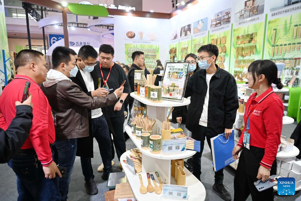 Visitors learns about bamboo and wood products at the 2023 China Cross-border E-commerce Trade Fair in Fuzhou, southeast China's Fujian Province, March 18, 2023. The 2023 China Cross-border E-commerce Trade Fair kicked off here on Saturday. (Xinhua/Lin Shanchuan)