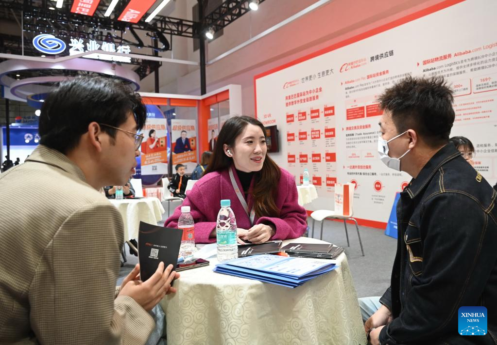 A visitor (R) communicates with a staff member (C) at the booth Alibaba at the 2023 China Cross-border E-commerce Trade Fair in Fuzhou, southeast China's Fujian Province, March 18, 2023. The 2023 China Cross-border E-commerce Trade Fair kicked off here on Saturday. (Xinhua/Lin Shanchuan)