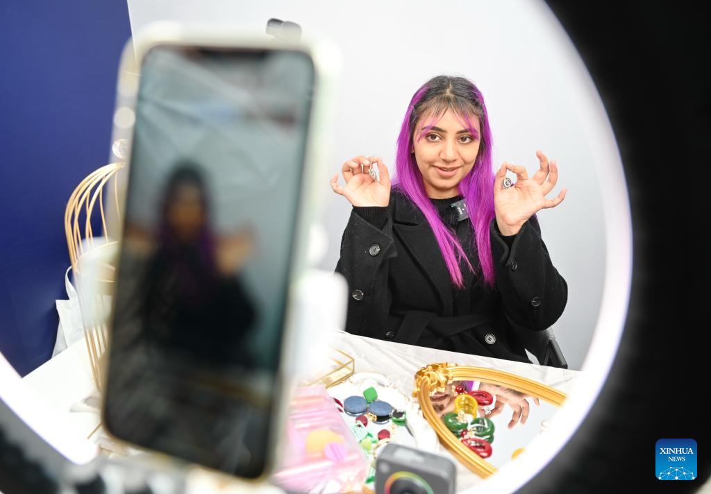 Pakistani girl Shaima promotes products through live streaming at the 2023 China Cross-border E-commerce Trade Fair in Fuzhou, southeast China's Fujian Province, March 18, 2023. The 2023 China Cross-border E-commerce Trade Fair kicked off here on Saturday. (Xinhua/Lin Shanchuan)