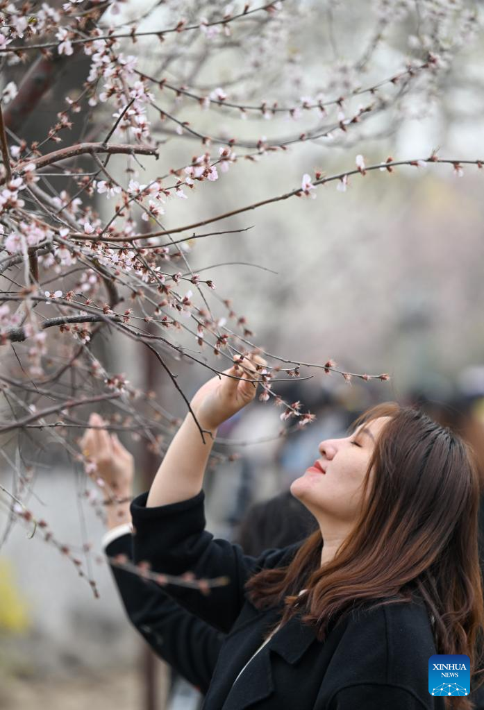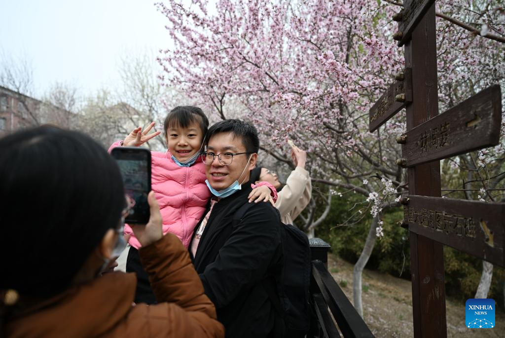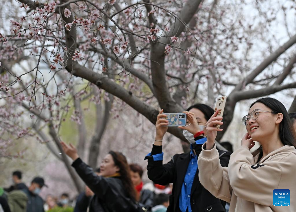 People visit the peach blossom embankment along the Grand Canal in Hongqiao district, north China's Tianjin, on March 19, 2023. As the weather gets warmer, the peach blossoms here are in full bloom and have attracted many tourists. (Xinhua/Zhao Zishuo)