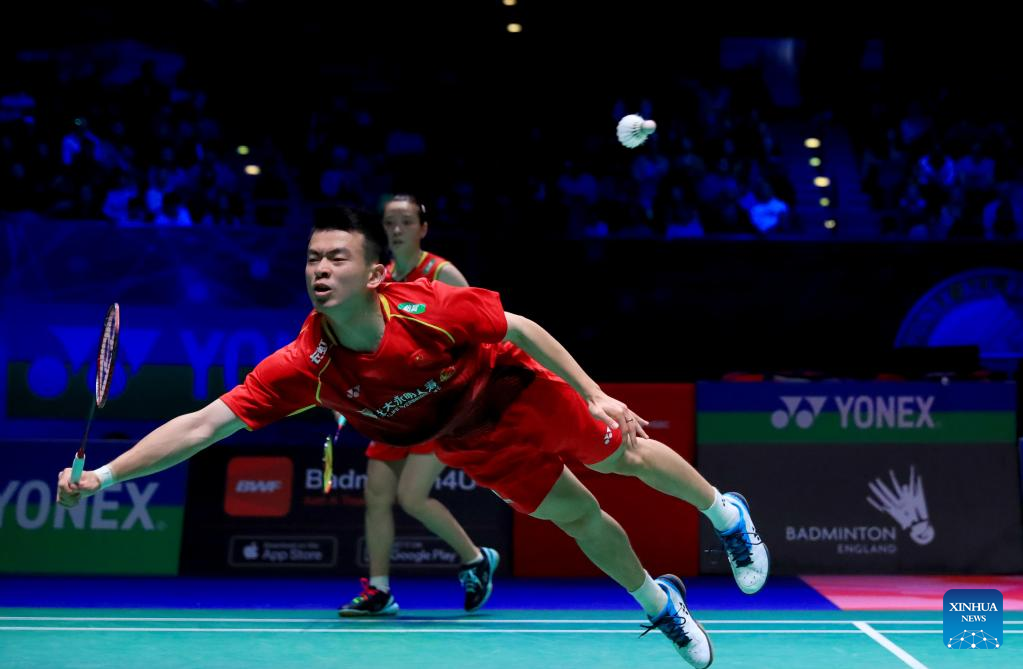 Zheng Siwei (front)/Huang Yaqiong of China compete during the mixed doubles final match against Seo Seung Jae/Chae Yu Jung of South Korea at All England Open Badminton Championships 2023 in Birmingham, Britain, March 19, 2023. (Xinhua/Li Ying)