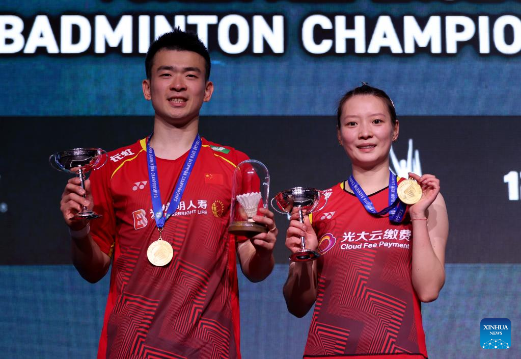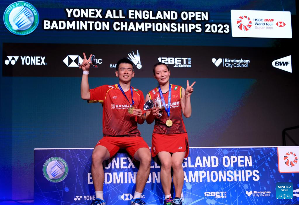Zheng Siwei (L)/Huang Yaqiong of China celebrate during the awarding ceremony after the mixed doubles final match against Seo Seung Jae/Chae Yu Jung of South Korea at All England Open Badminton Championships 2023 in Birmingham, Britain, March 19, 2023. (Xinhua/Li Ying)