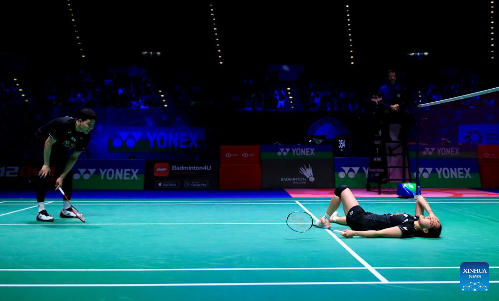 Seo Seung Jae (L)/Chae Yu Jung of South Korea react during the mixed doubles final match against Zheng Siwei/Huang Yaqiong of China at All England Open Badminton Championships 2023 in Birmingham, Britain, March 19, 2023. (Xinhua/Li Ying)