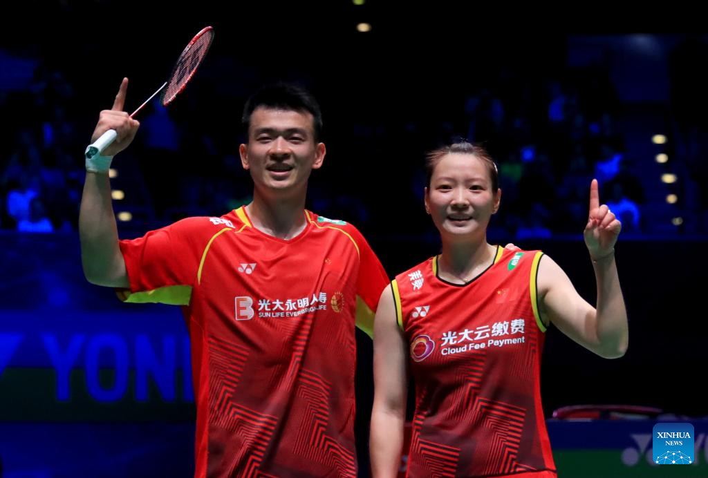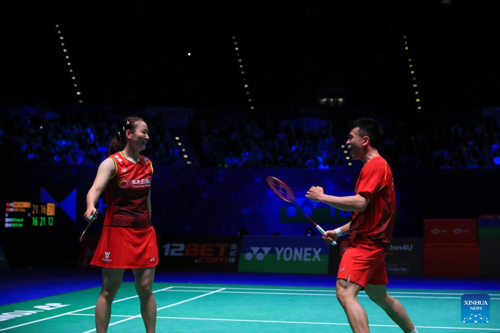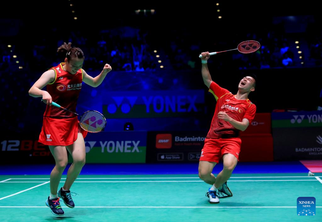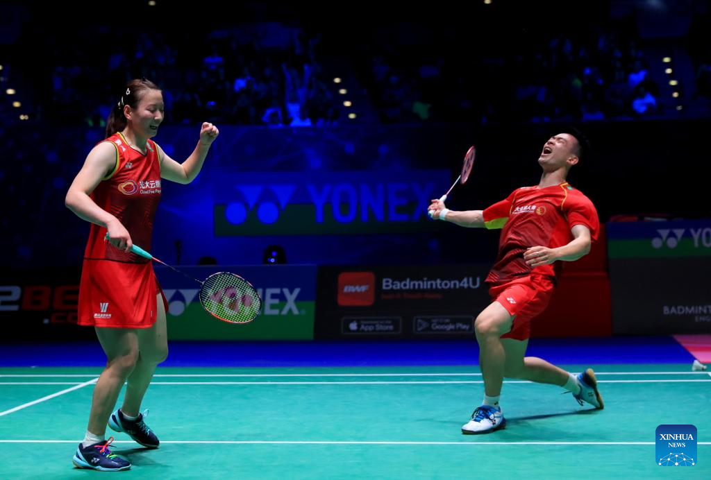 Zheng Siwei (L)/Huang Yaqiong of China celebrate after the mixed doubles final match against Seo Seung Jae/Chae Yu Jung of South Korea at All England Open Badminton Championships 2023 in Birmingham, Britain, March 19, 2023. (Xinhua/Li Ying)