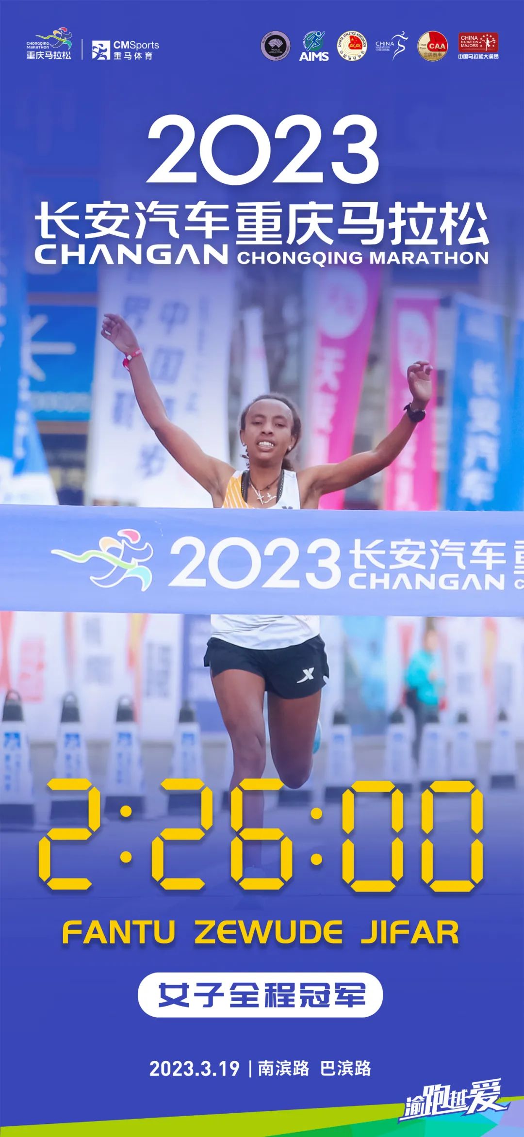 Fantu Zewude Jifar from Ethiopia wins first place in the women’s group. (Photo/Chongqing Marathon)