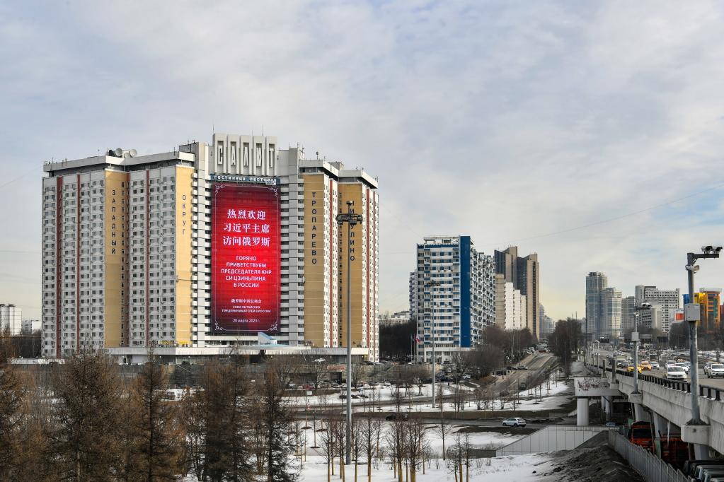 This photo taken on March 20, 2023 shows a welcome sign for Chinese President Xi Jinping in Moscow, Russia. At the invitation of Russian President Vladimir Putin, Chinese President Xi Jinping arrived here on Monday afternoon for a state visit to Russia through Wednesday. (Xinhua/Cao Yang)