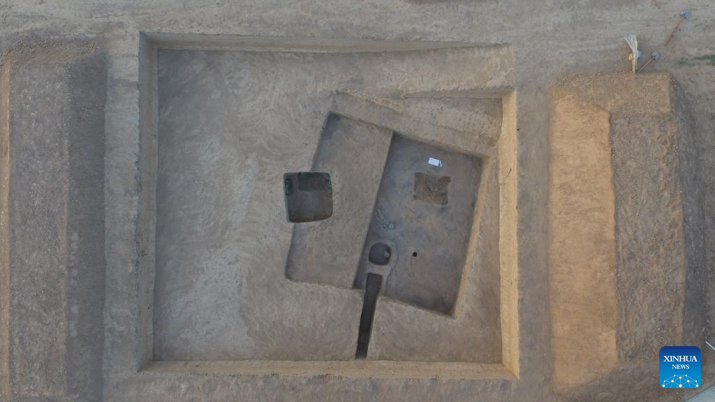 This aerial photo shows a house foundation that covers around 30 square meters unearthed at an archaeological site in Xinghuacun Township in Fenyang City, north China's Shanxi Province. (Institute of cultural relics and archaeology of Shanxi/Handout via Xinhua)