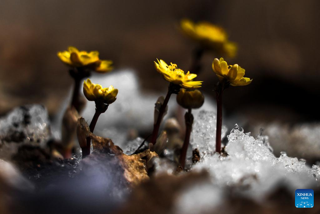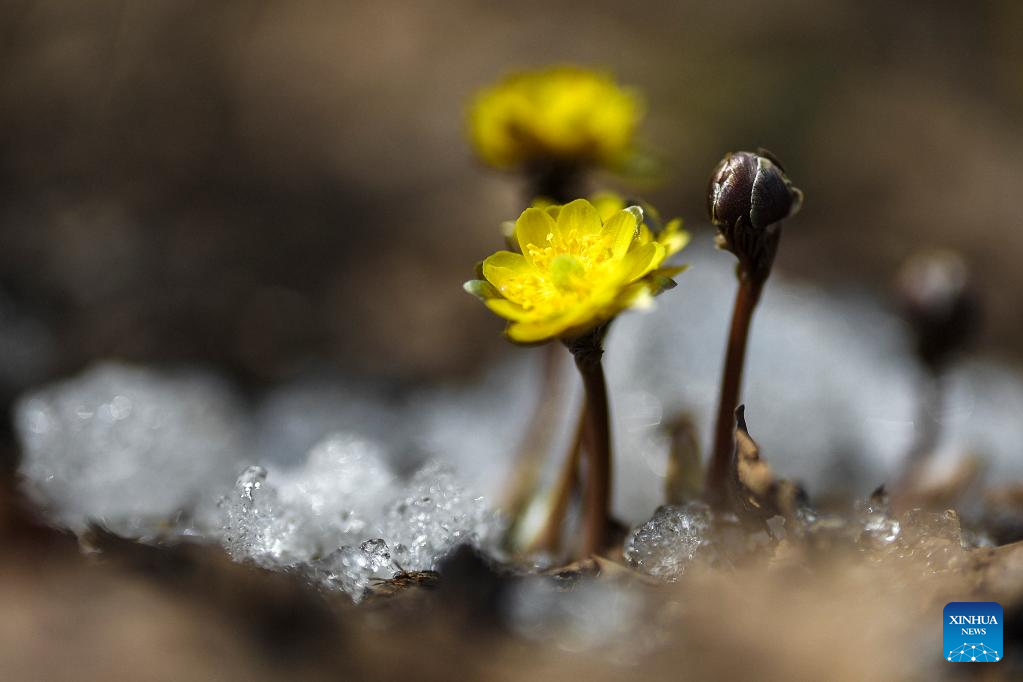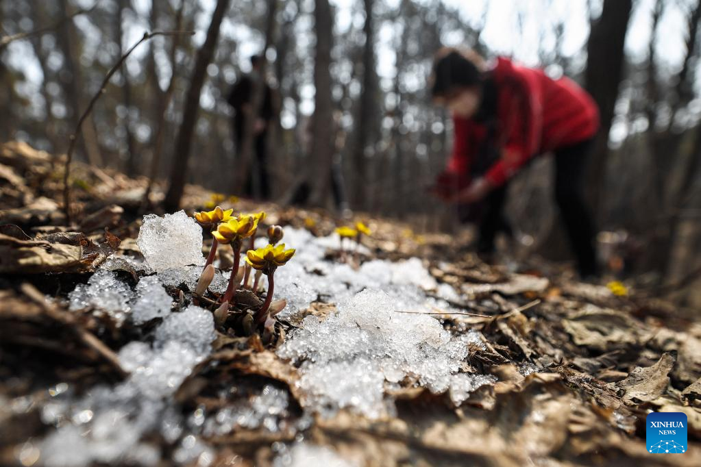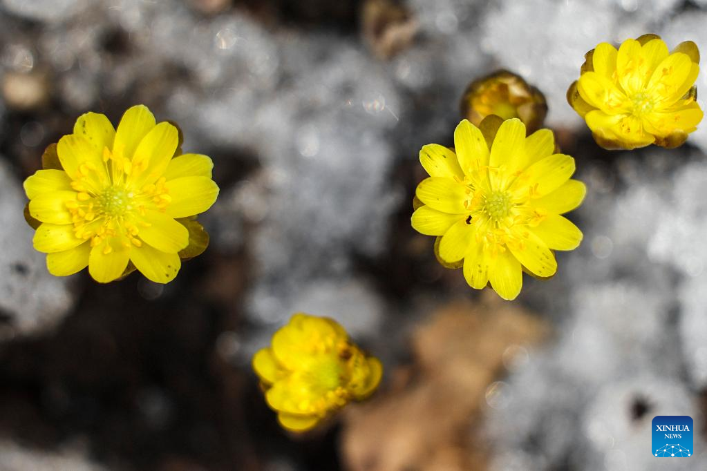 This photo taken on March 20, 2023 shows the blooming adonis amurensis at Jingyuetan national forest park in Changchun, northeast China's Jilin Province. (Xinhua/Xu Chang)