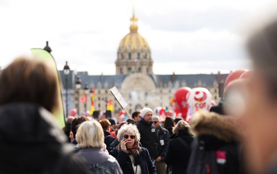 People demonstrate against the government's pension reform plan in Paris, France, March 15, 2023. (Xinhua/Gao Jing)