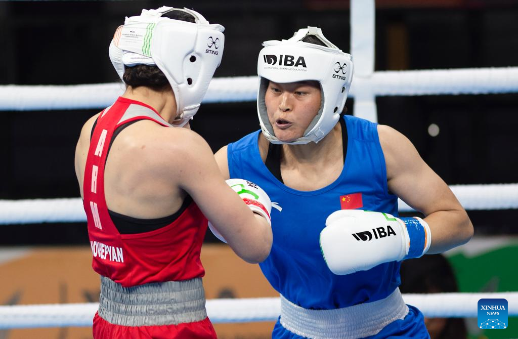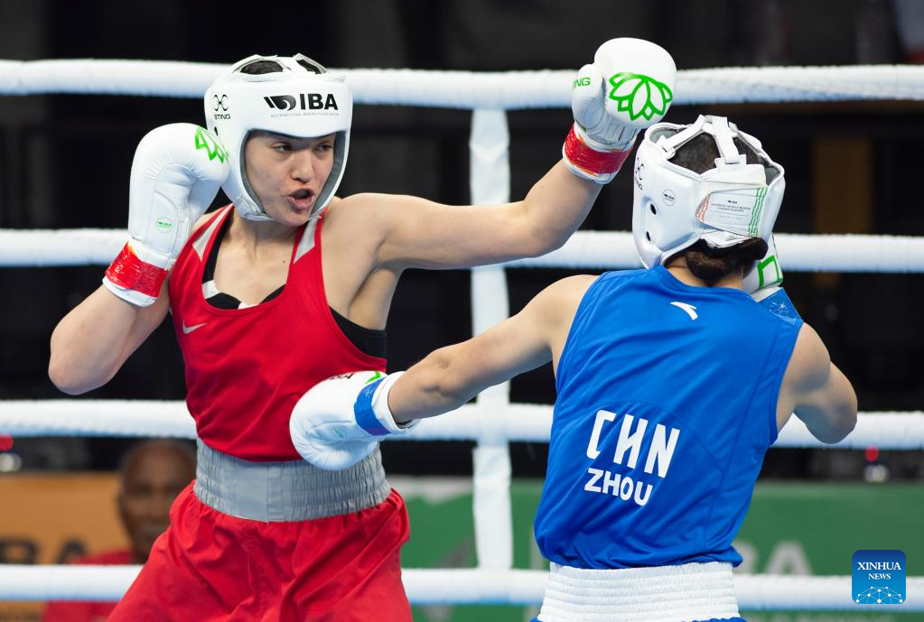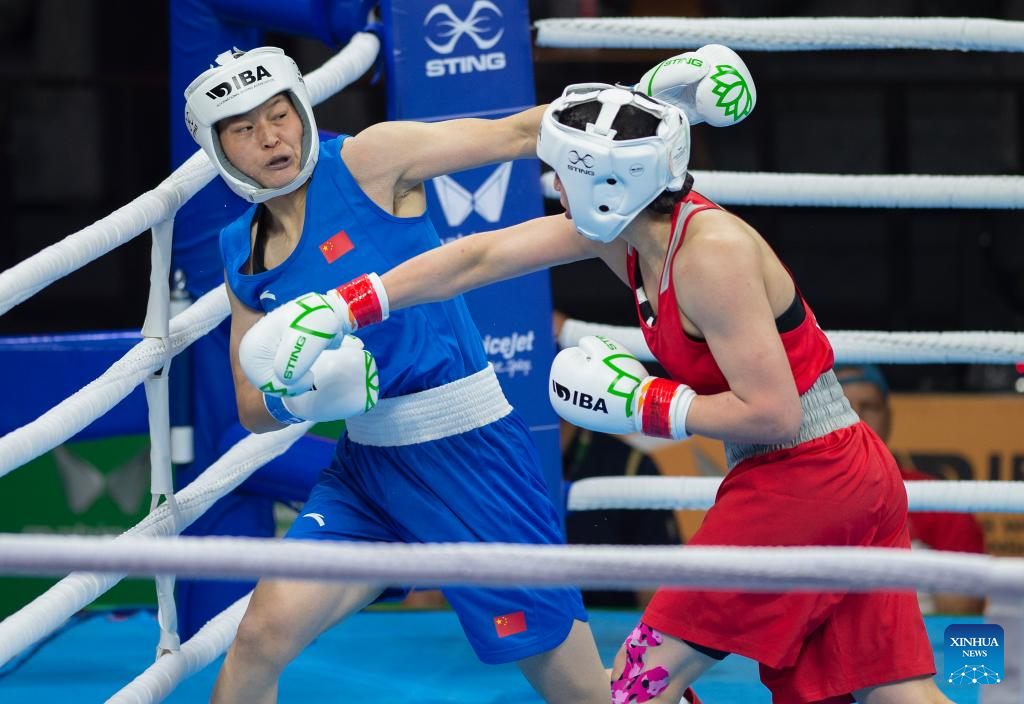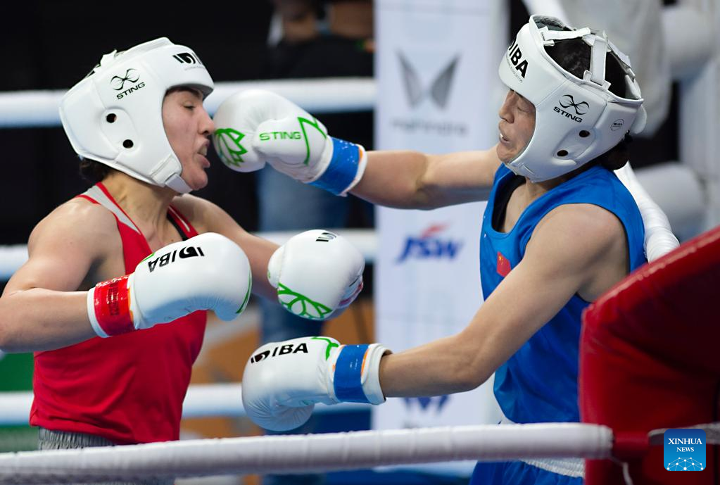 Zhou Pan (R) of China competes against Ani Hovsepyan of Armenia during the elite 66-70kg light middle round of 16 match of the IBA World Women's Boxing Championships 2023 in New Delhi, India, March 20, 2023. (Xinhua/Javed Dar)