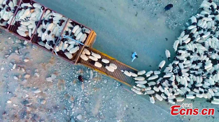 Herdsmen unload livestock on to a truck on the journey to spring pastures at Bayingol Mongolian Autonomous Prefecture, northwest China's Xingjiang Uygur Autonomous Region. (Photo: China News Service/Gan Minglian)