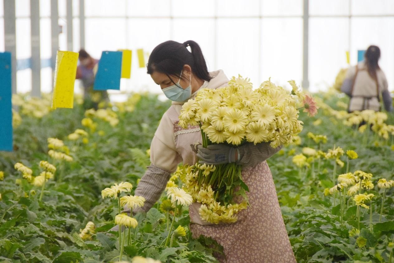 Workers pick flowers in a national-level modern agricultural park in Honghe Hani and Yi autonomous prefecture, southwest China's Yunnan province. (People's Daily Online/Xue Yingying)