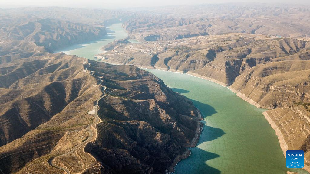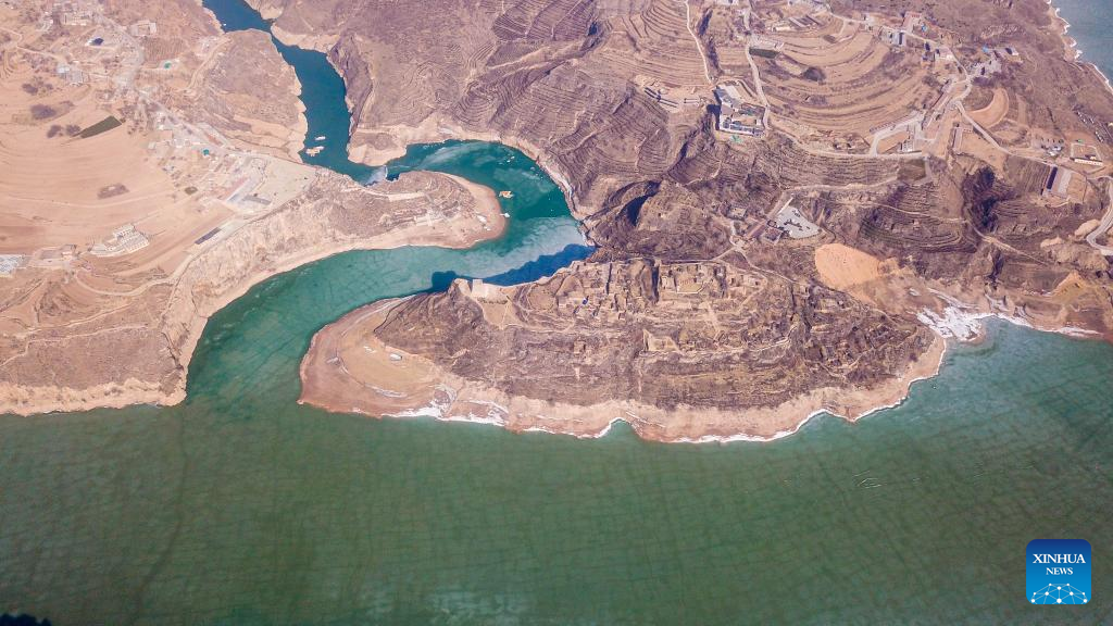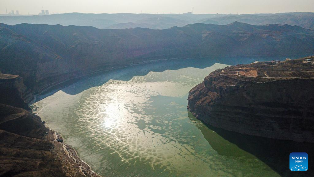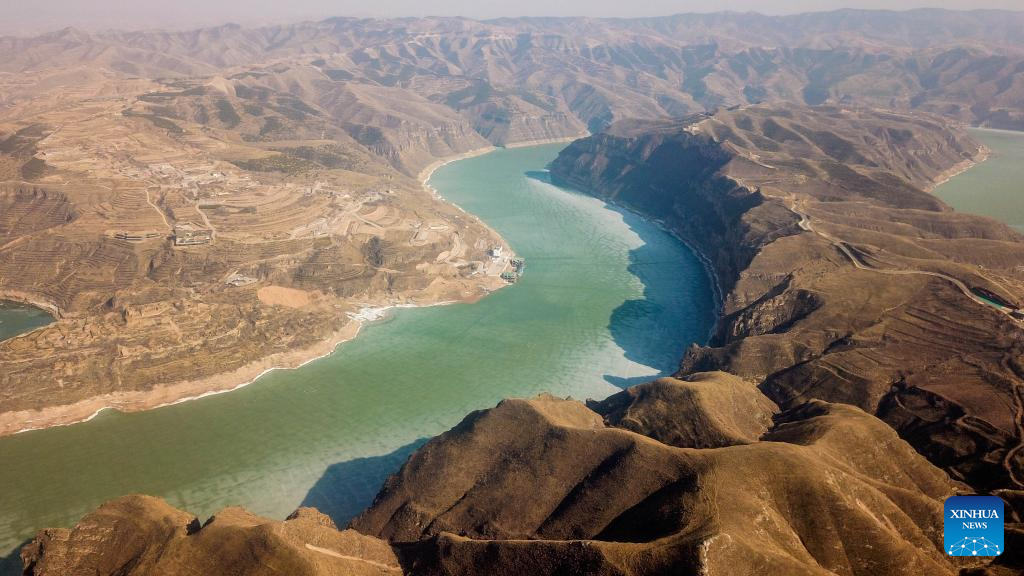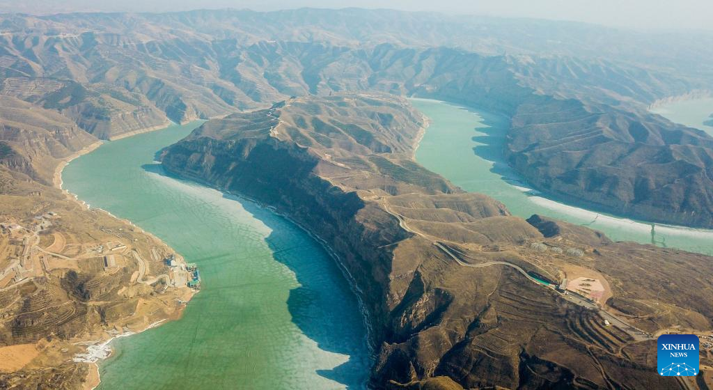 This aerial photo taken on March 20, 2023 shows the scenery at the Laoniuwan section of the Yellow River in Jungar Banner, Erdos, north China's Inner Mongolia Autonomous Region. (Xinhua/Peng Yuan)