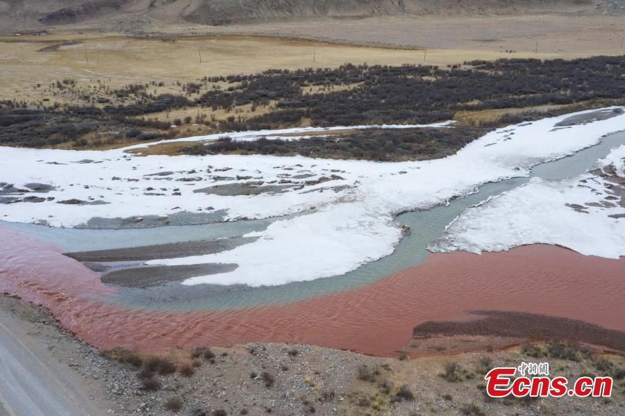 Aerial view shows two rivers meet at the confluence of Hongshui River with two colors at Dulan County, Haixi Mongolian Tibetan Autonomous Prefecture, northwest China's Qinghai Province, March 20, 2023. (Photo: China News Service/Ma Mingyan)