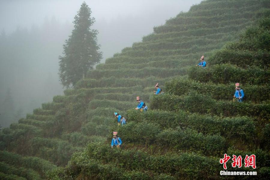Villagers of Qiang ethnic group in traditional costumes pick tea leaves at a tea garde, Hongya County, southwest China's Sichuan Province, March 21, 2023. (Photo: China News Service/Liu Zhongjun)