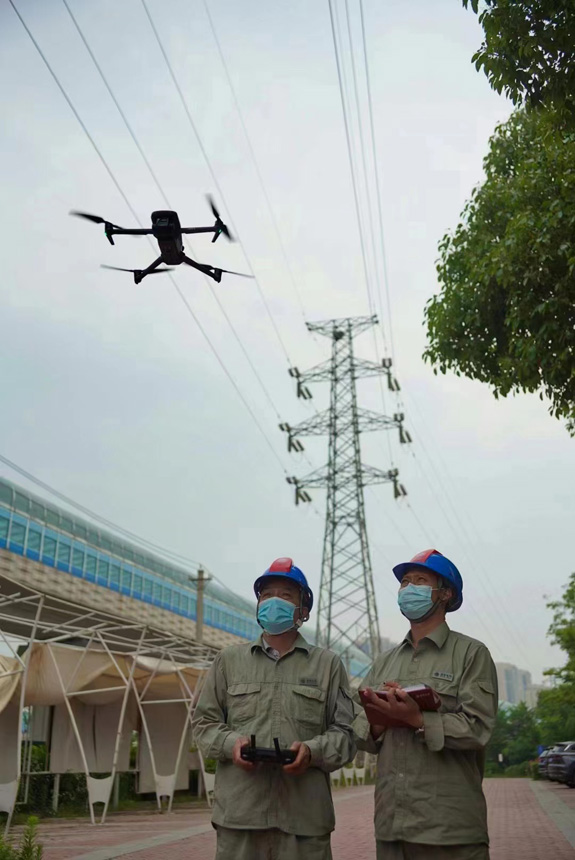 Staff members from the State Grid Wuhan Power Supply Company operate a drone to conduct intelligent power inspections in Wuhan, central China’s Hubei Province. (Photo/Wang Chen)