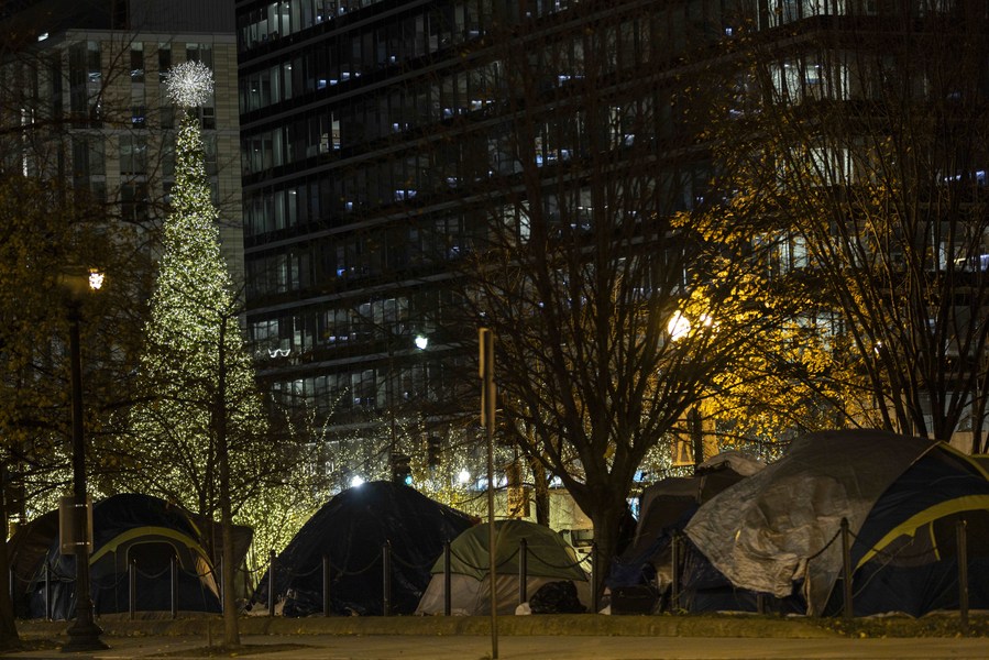 Tents of the homeless are seen in Washington, D.C., the United States, Dec. 8, 2021. (Xinhua)
