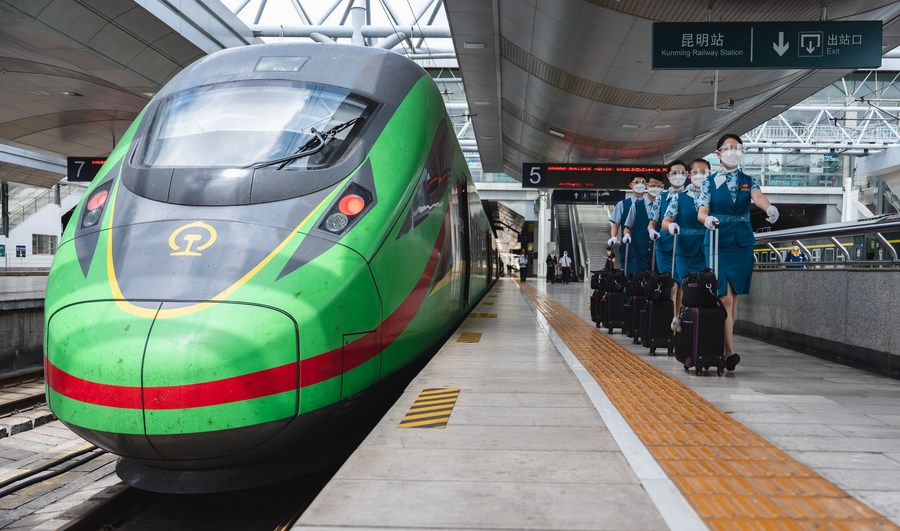 Stewards of China Railway Kunming Bureau Group Co., Ltd. are pictured in Kunming Railway Station in southwest China's Yunnan Province, June 2, 2022. As a landmark project under the Belt and Road Initiative, the China-Laos Railway connects China's Kunming with the Lao capital Vientiane. (Xinhua/Wang Guansen)