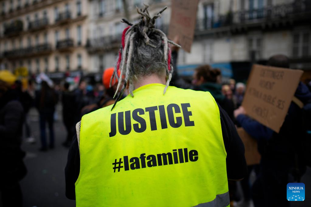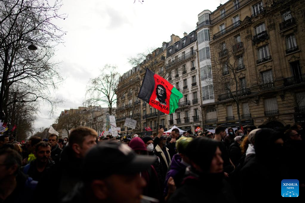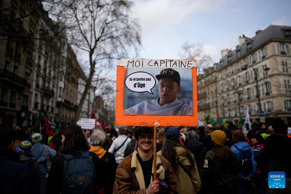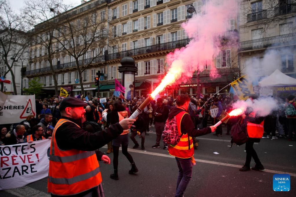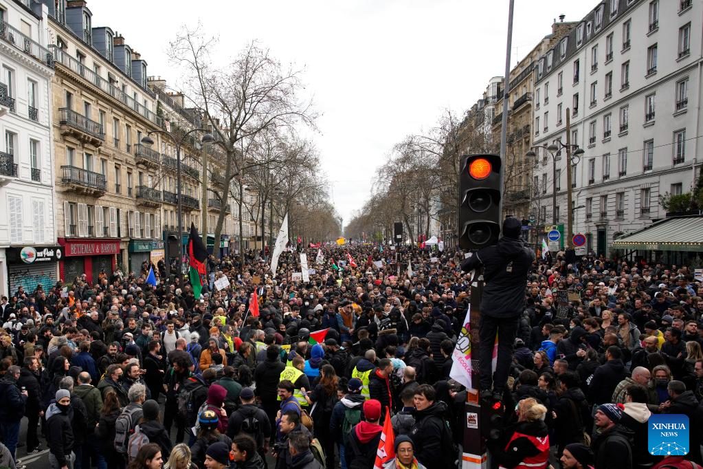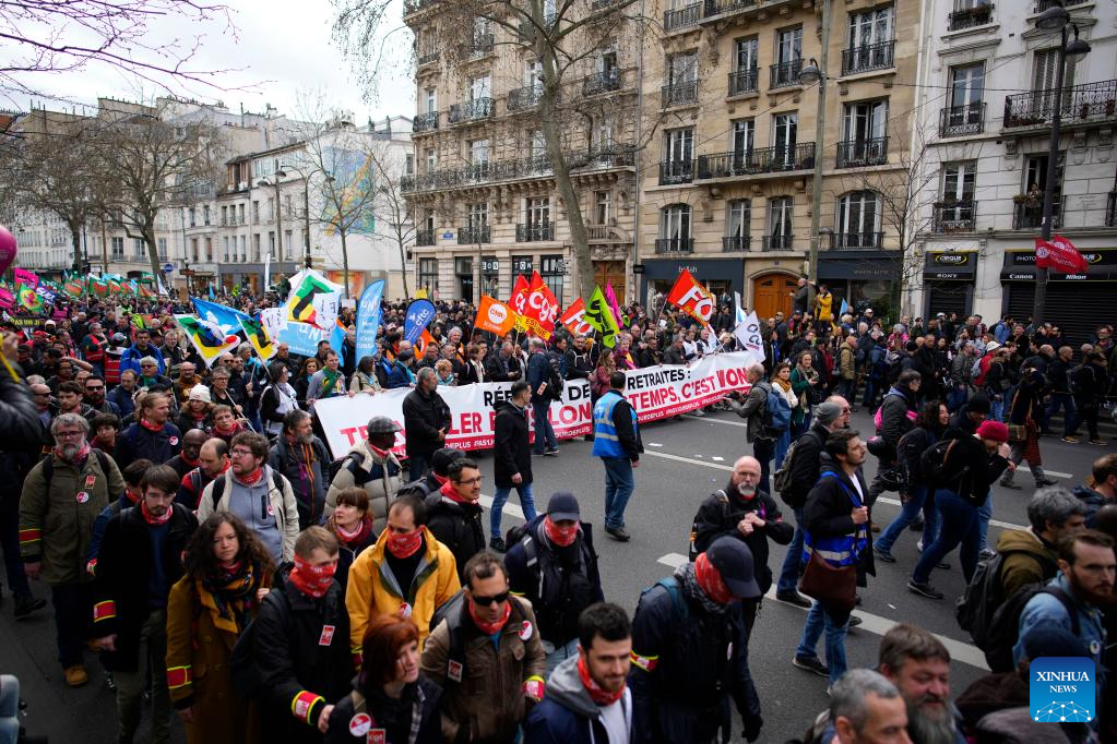 PARIS, March 23 (Xinhua) -- Over 1 million people in France joined nationwide protests on Thursday, rejecting the government's proposed pension reform bill that would raise the retirement age from 62 to 64, French ministry of the interior said on Thursday evening.
