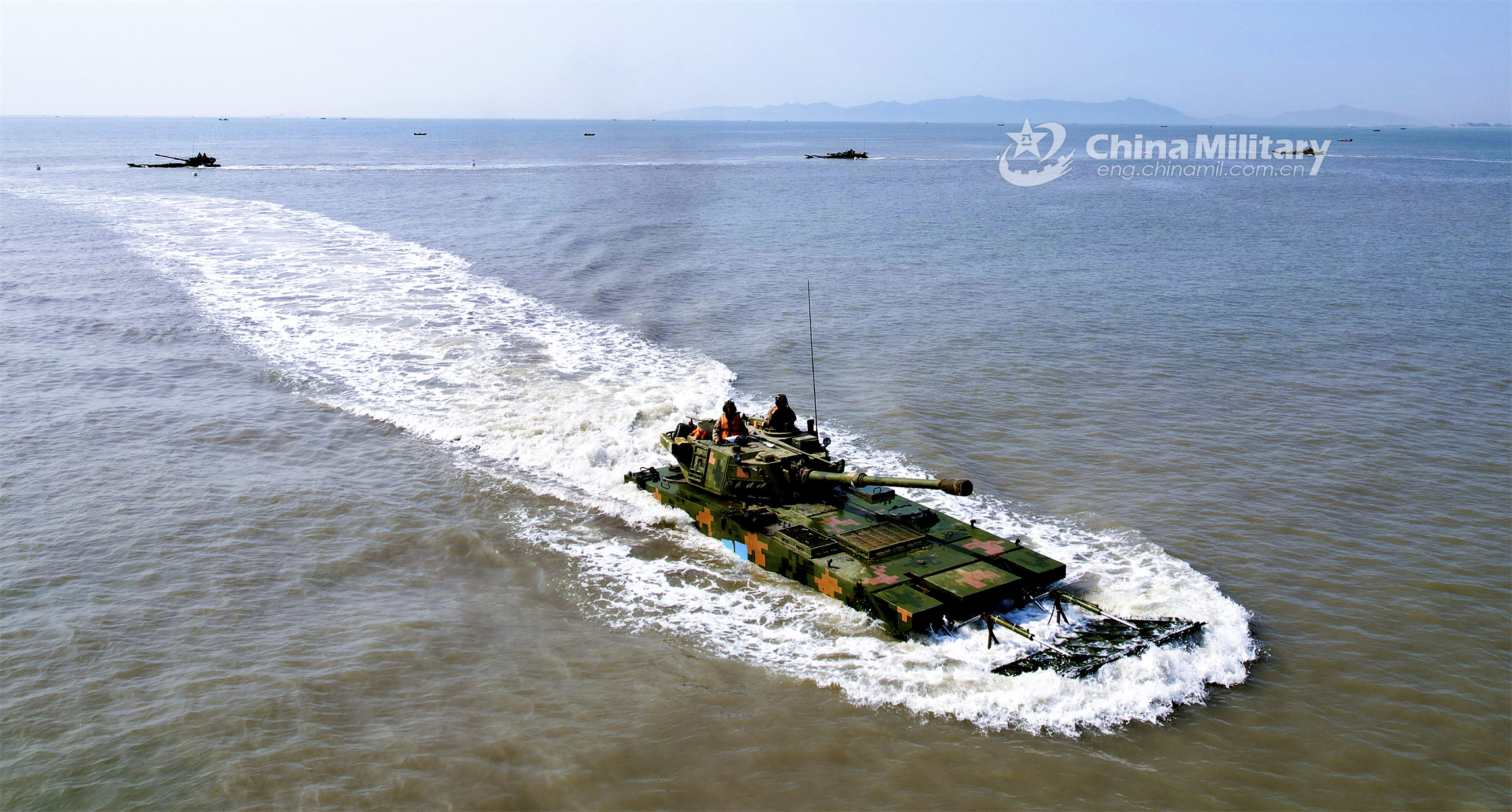 Amphibious armored vehicles attached to a brigade of the PLA 73rd Group Army make their way in formation during a maritime driving training exercise in mid-March, 2023. (eng.chinamil.com.cn/Photo by Fan Xiaoming)