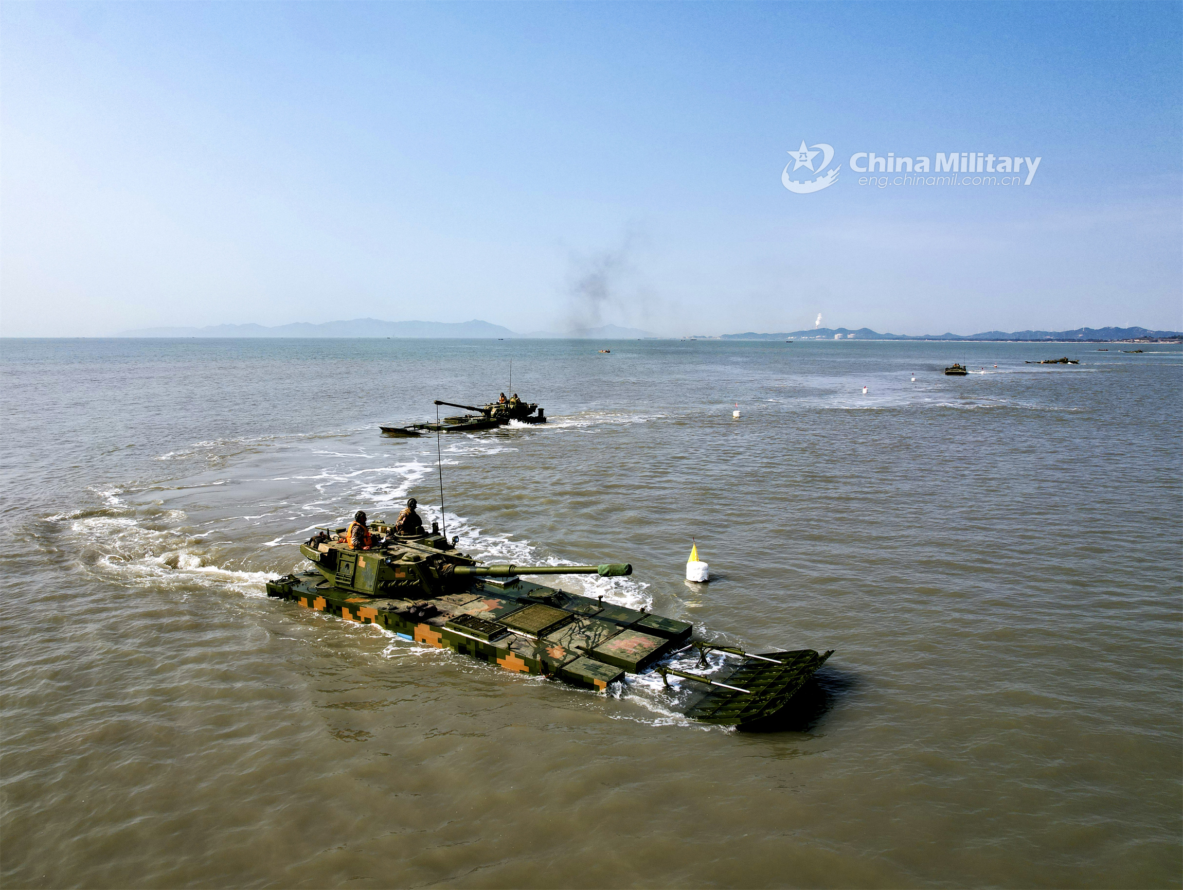 Amphibious armored vehicles attached to a brigade of the PLA 73rd Group Army make their way in formation during a maritime driving training exercise in mid-March, 2023. (eng.chinamil.com.cn/Photo by Fan Xiaoming)