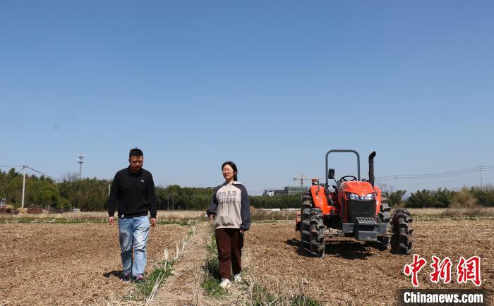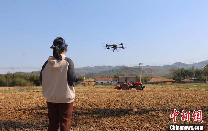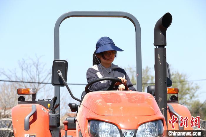 Zhou Dan drives an agricultural machinery to plow the field. (Chinanews.com/Xiang Jing)