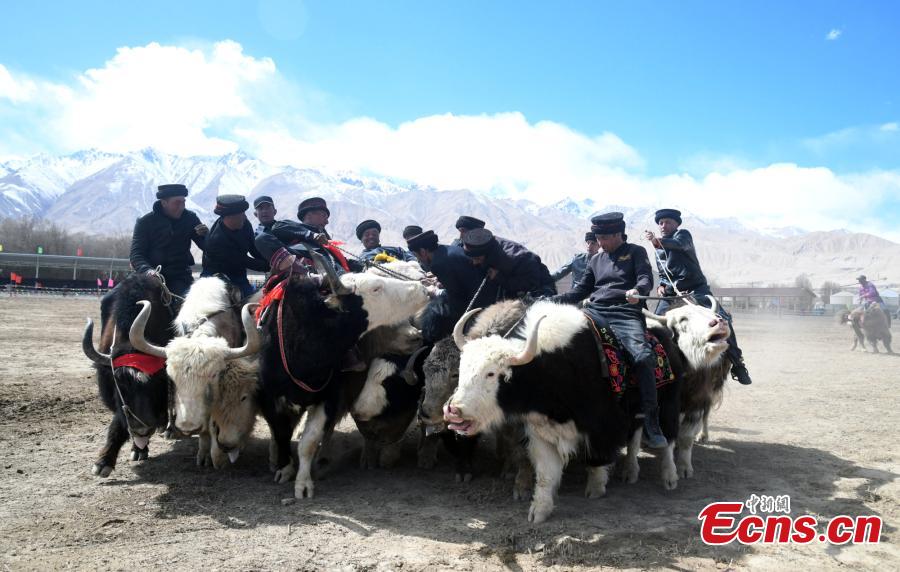 Tajik herdsmen ride yaks to catch a goat to greet the start of spring on the Pamir Plateau in Taxkorgan Tajik Autonomous County in Kashgar prefecture, northwest China's Xinjiang Uygur Autonomous Region, March 21, 2023. (Photo: China News Service/Sun Tingwen)