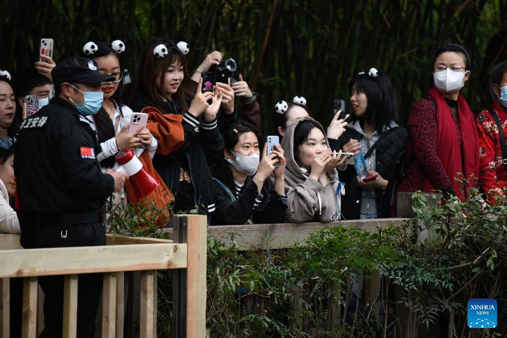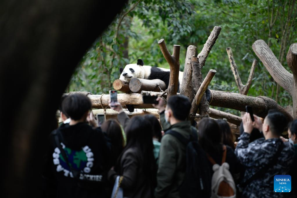 Visitors take pictures at Chengdu Research Base of Giant Panda Breeding in Chengdu, southwest China's Sichuan Province, March 22, 2023. (Xinhua/Xu Bingjie)