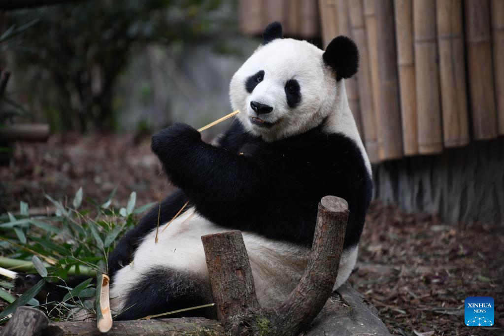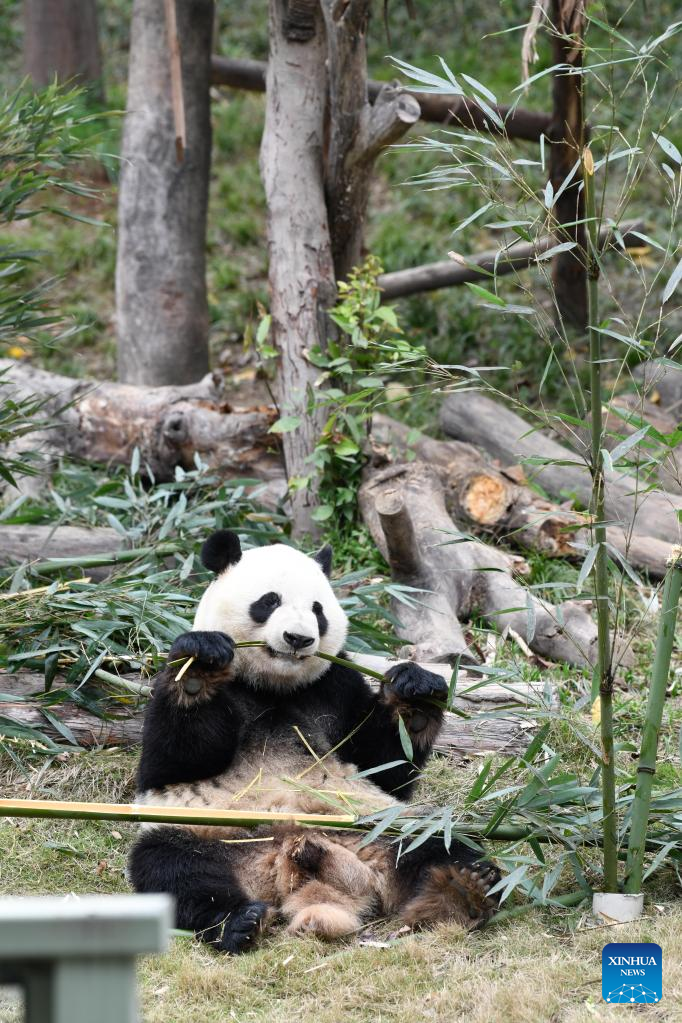 Giant panda Fu Shun eats fresh bamboo at Chengdu Research Base of Giant Panda Breeding in Chengdu, southwest China's Sichuan Province, March 22, 2023. (Xinhua/Xu Bingjie)
