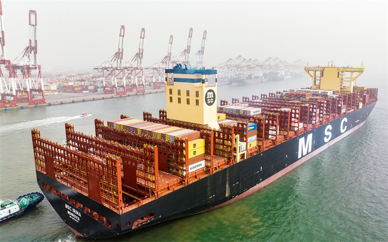 MSC Irina, the world’s largest mega container vessel, sails from a container terminal in the Qingdao Port, east China’s Shandong Province, on March 23, 2023. (Photo/Hou Fangchao)