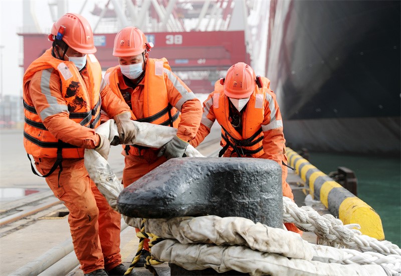 Dock workers loosen a rope of MSC Irina, the world’s largest mega container vessel, at a container terminal in the Qingdao Port, east China’s Shandong Province, on March 23, 2023. (Photo/Zhang Jingang)
