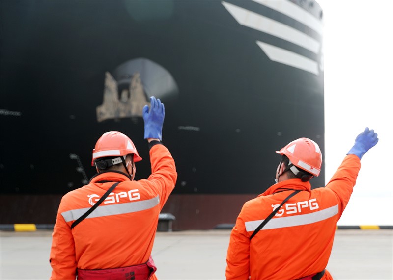 Dock workers wave farewell to MSC Irina, the world’s largest mega container vessel, at a container terminal in the Qingdao Port, east China’s Shandong Province, on March 23, 2023. (Photo/Zhang Jingang)