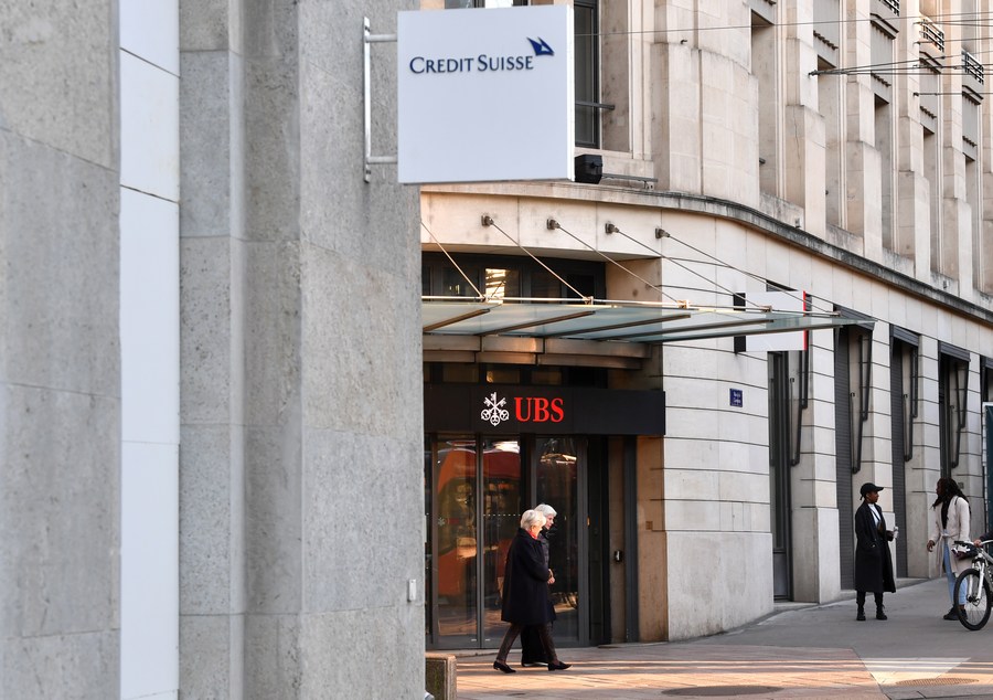 This photo taken on March 20, 2023 shows logos of Credit Suisse and Swiss banking giant UBS in Geneva, Switzerland. (Xinhua/Lian Yi)