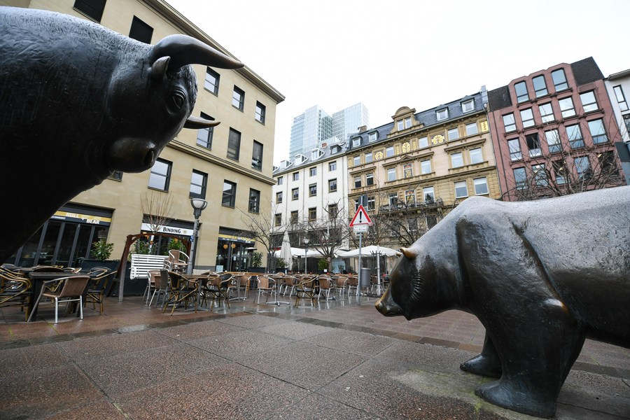 Photo taken on Feb. 24, 2022 shows the Bull and Bear sculptures outside the Frankfurt Stock Exchange in Frankfurt, Germany. (Xinhua/Lu Yang)