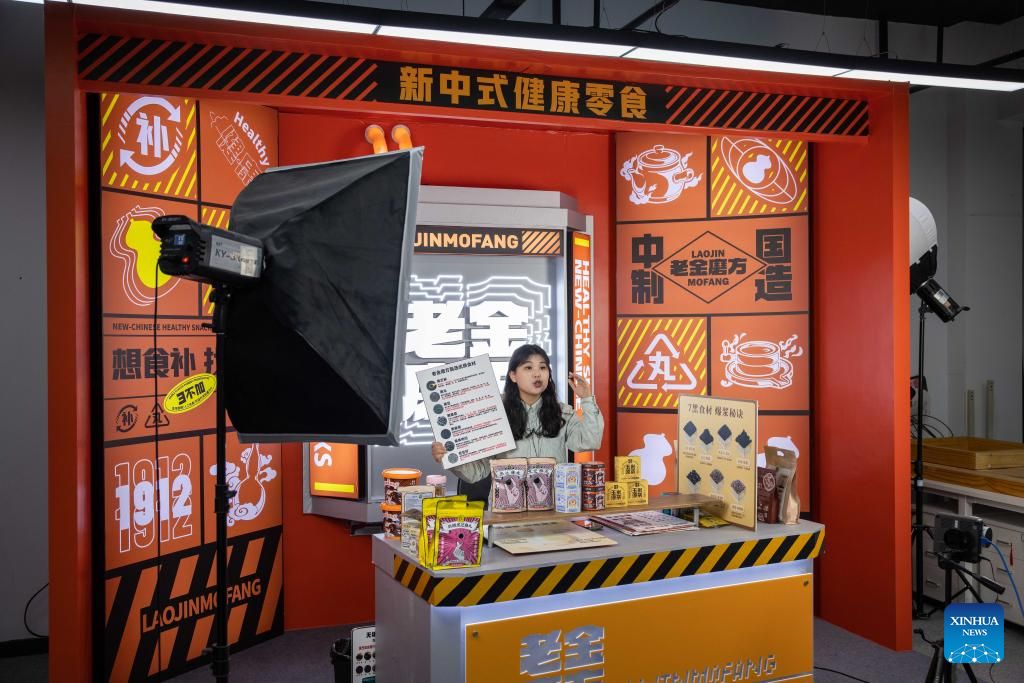 A seller promotes snacks via livestreaming at a health industry company in Hangzhou, east China's Zhejiang Province, March 23, 2023. (Xinhua/Jiang Han)