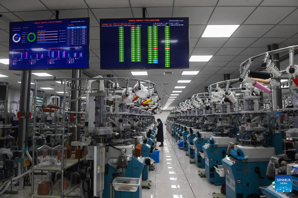 A woman works at a digital workshop of a hosiery company in Anhua Township of Zhuji, east China's Zhejiang Province, March 21, 2023. (Xinhua/Xu Yu)