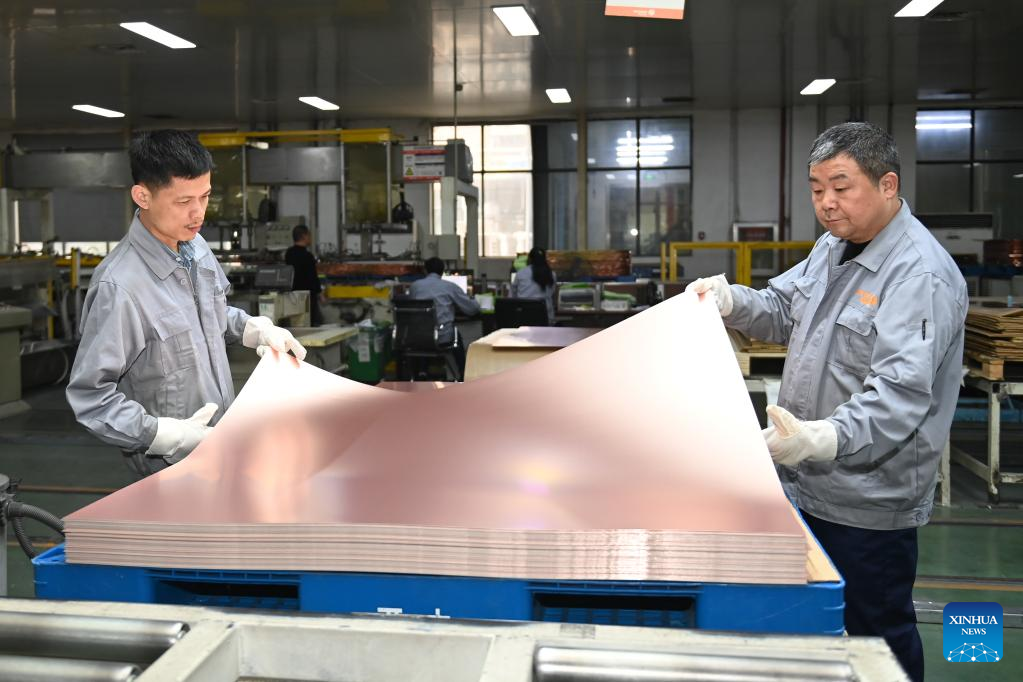 Workers work at a copper clad plate workshop of Wazam New Materials in Hangzhou, east China's Zhejiang Province, March 23, 2023. (Xinhua/Huang Zongzhi)