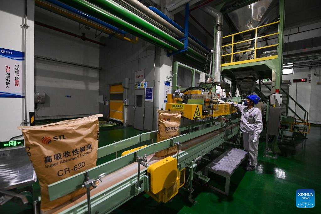 A worker works at an automatic packaging line in Jiaxing base of Satellite Chemical Co., Ltd. in east China's Zhejiang Province, March 23, 2023. (Xinhua/Xu Yu)