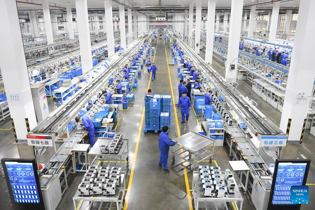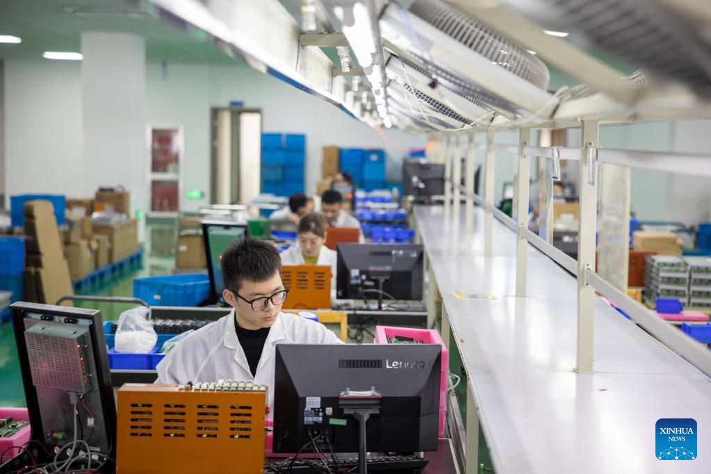 Employees work at a production line of Ningbo EST Technology Co., Ltd. in Ningbo, east China's Zhejiang Province, March 21, 2023. (Xinhua/Jiang Han)