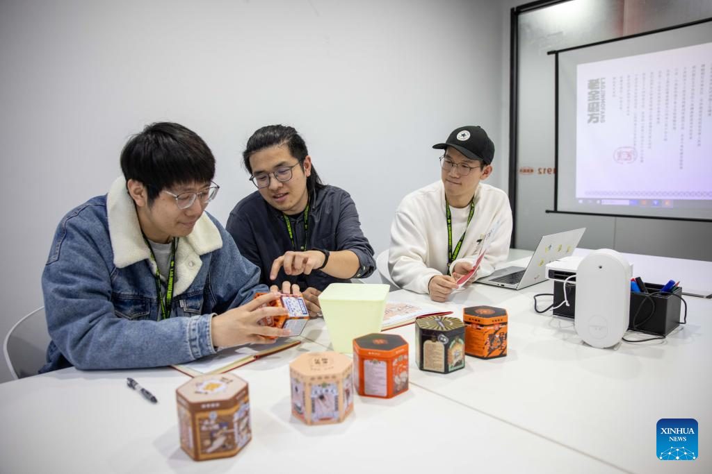 Staff members discuss the design of package at a health industry company in Hangzhou, east China's Zhejiang Province, March 23, 2023. (Xinhua/Jiang Han)
